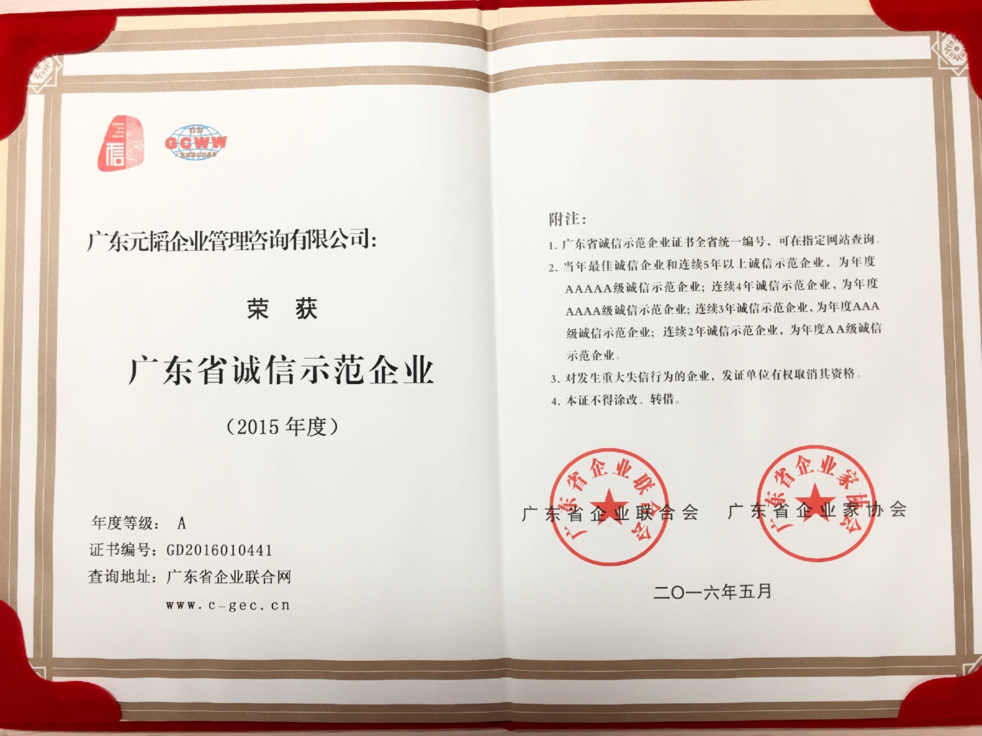 元韬公司榮獲“2015年(nián)度廣東(dōng)省誠信示範企業(yΩ↑è)”