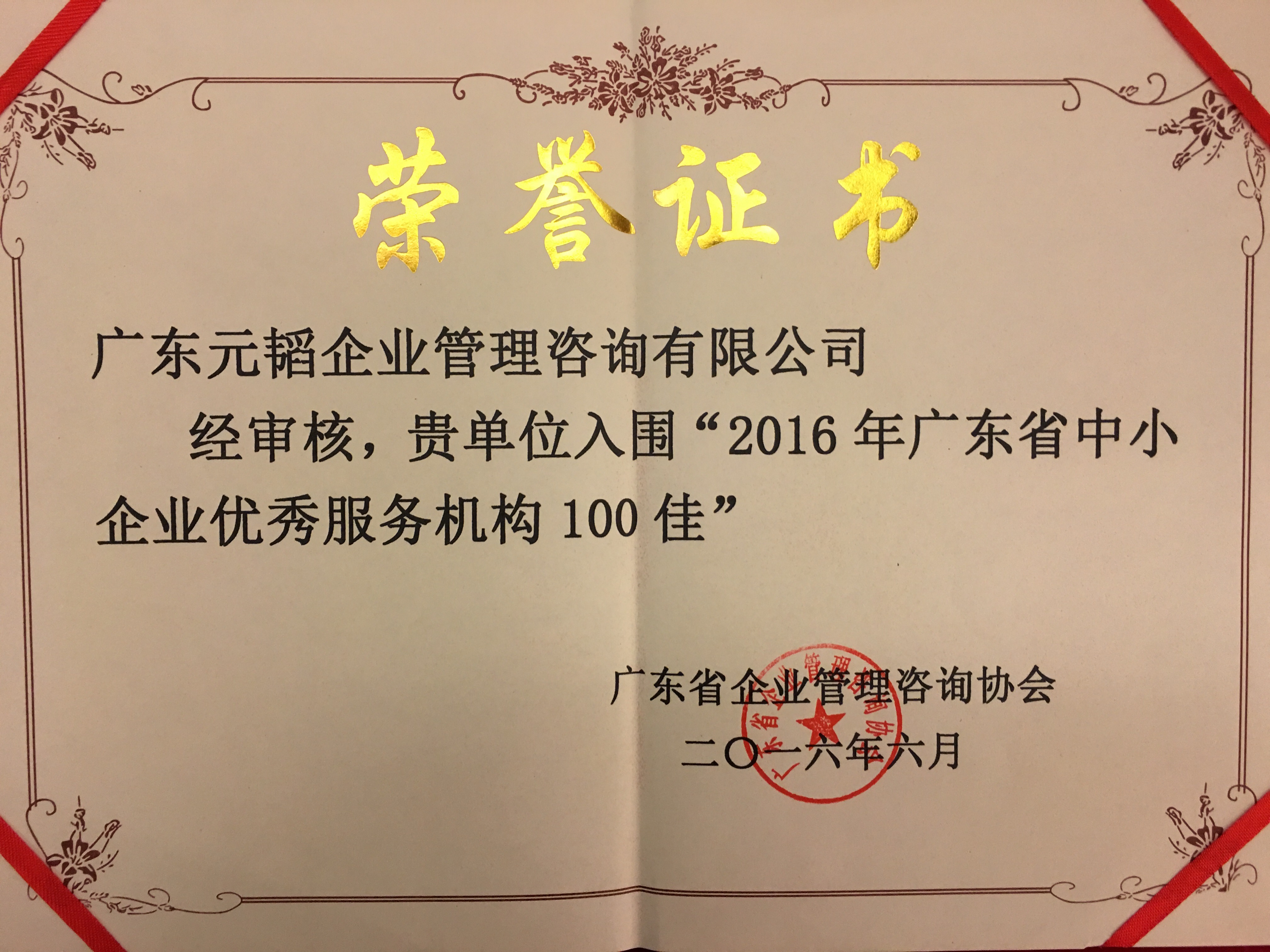 圖5 元韬公司榮獲“2016年(nián)度廣東(dōng)省中小(xiǎo)微(∏α¶δwēi)企業(yè)服務機(jī)構100佳“