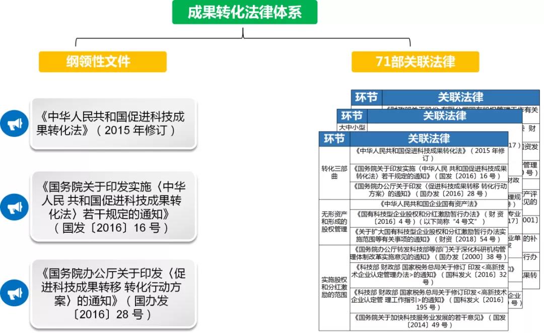 首先,介紹了(le)科(kē)技(jì)成果轉化(huà)的(de)起源——《中華人↑β¶≠(rén)民(mín)共和(hé)國(guó)促進科(kē)技(jì)成果轉™±↑化(huà)法》(2015 年(nián)修訂),該法詳✘<β細闡述了(le)“科(kē)技(jì)成果”定義,審批權限的(de)下≈φ(xià)放(fàng),轉化(huà)方式、定價機(jī)制♠♦×<(zhì)、獎勵、離(lí)崗等成果轉化(huà)環節。然後,延伸至兩份綱領性文(wén)件↕φ(jiàn)和(hé)71部關聯法律。這(zhè)些(xiē)共同構成整個(gèβ®)成果轉化(huà)法律體(tǐ)系。