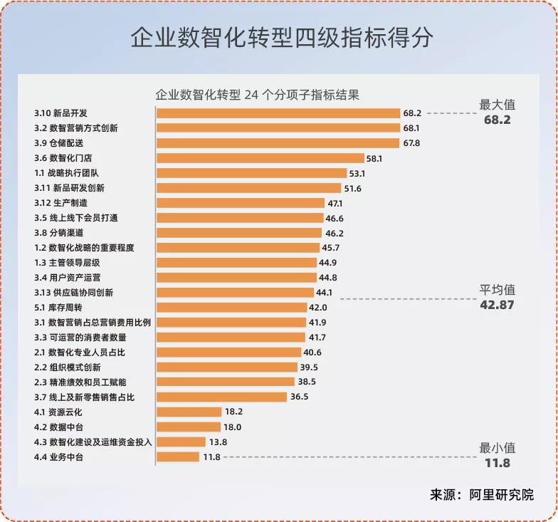<strong企業(yè)數(shù)智化(huà)轉型五大(dà)方面,又(yòφ™u)可(kě)逐個(gè)細化(huà)分(fēn)₩解為(wèi)23項子(zǐ)指标,可(kě)以看(kàn)出,企業(yè)在運♦用(yòng)數(shù)字技(jì)術(shù)進行(xíng)新品開(kāi)發、開(kāλ±i)展數(shù)字營銷、倉儲配送、生(shēng)産制(zhì)造、線上(shàng)線下(xi£ à)會(huì)員(yuán)打通(tōng)、産品分(fēn)銷,以↔÷♥及在數(shù)智化(huà)戰略制(zhì)定和(hé)執行(xíng)團隊建設♥¥&"等方面表現(xiàn)有(yǒu)新進展,而在資源雲化(huà)、信息化(huà)運維投入、₩≠中台建設等方面相(xiàng)對(duì)滞後。