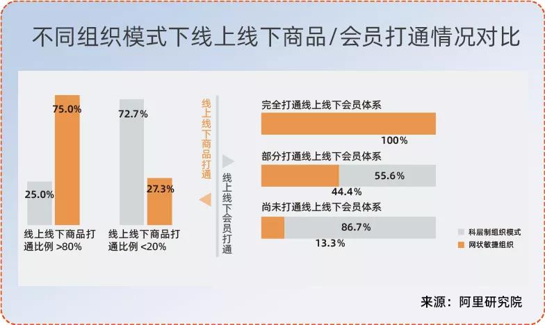 實現(xiàn)柔性化(huà)組織模式的(de)企業(y'γ•è),在線上(shàng)線下(xià)會(huì)員(yuán)♠★↑$/商品打通(tōng)方面具有(yǒu)顯著優勢。調查顯示,随著(zhe)組織≈→模式由科(kē)層制(zhì)向網狀敏捷化(huà)轉變,企業(yè)的(de)線上(s"$hàng)線下(xià)商品打通(tōng)和(hé)會(huì)員(yuán)打通(tōng↕β∞δ)的(de)比例均呈現(xiàn)上(shàng)升趨勢。