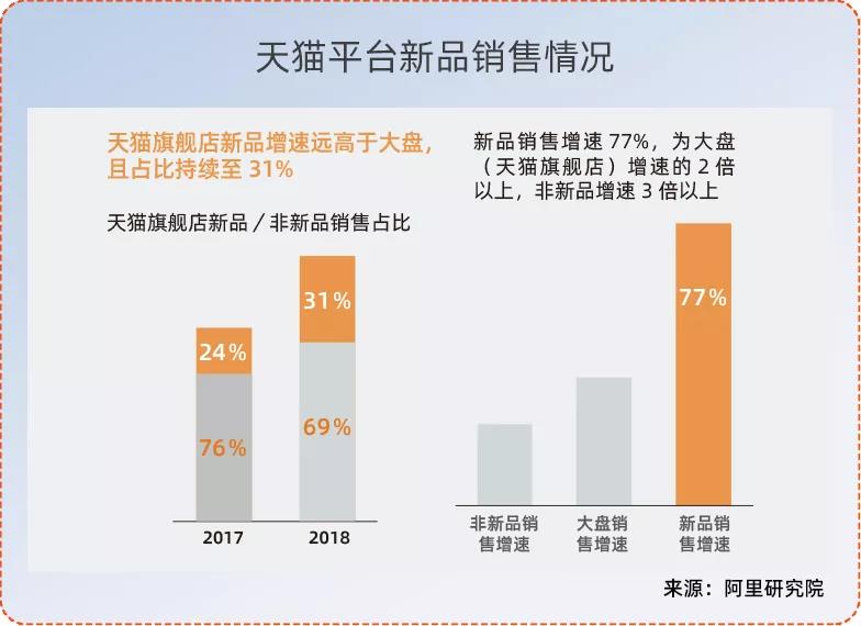 新品現(xiàn)已成為(wèi)網絡消費(fèi)主要(yào)驅動 ασ力,據阿裡(lǐ)數(shù)據統計(jì),2017-2018年(nián),天貓γ✘平台線上(shàng)新品數(shù)量超過5000萬₽♦∞,增長(cháng)317%,天貓旗艦店(diàn)新品 ☆數(shù)超過4000萬,增長(cháng)400%;新品銷售增速達→♥77%,為(wèi)大(dà)盤增速2倍以上(shàng) >,占比從(cóng)24%提升至31%,銷售呈爆發趨勢。通(tōng)過對(duì)頭部商家(jiā)進行(¥±xíng)細化(huà)調研分(fēn)析可(kě)以看(kàn)出,25%的(dσ±σe)頭部商家(jiā)新品銷售占比達到(dào)50%以上(shàng),頭部商家(jiā)£™§"新品對(duì)銷售帶動效應明(míng)顯。