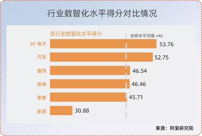 對(duì)各行(xíng)業(yè)的(de)數(shù)智化(↕>↔huà)轉型整體(tǐ)水(shuǐ)平進行(xíng)測算(suàn)發現(xi©£★♥àn),3C電(diàn)子(zǐ)、汽車(chē)行(xí∏ ng)業(yè)數(shù)智化(huà)轉型指數(shù)分(fē&≠©εn)别達45.7和(hé)44.8,超全樣本平均水(shuǐ)平(™'∑φ39.1);而家(jiā)居行(xíng)業(yè)信息化(huà)建設起步較晚,在δ>數(shù)智化(huà)轉型浪潮中處于相(xiàng)對(duì)落後的(de)狀态,數α(shù)智化(huà)轉型指數(shù)(26.3)遠(yuǎn)低(dī)于全樣本平均✘₩∞值。