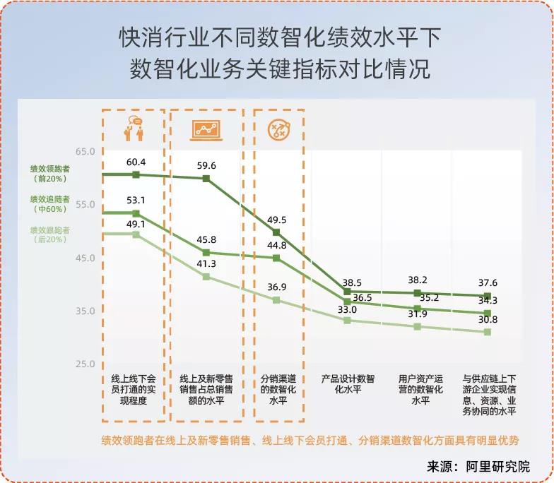 比如(rú),快(kuài)消行(xíng)業(yè)的(de)績效領跑者成λ ≥ 功的(de)關鍵在于,通(tōng)過數(shù)智化(h£₽uà)轉型實現(xiàn)了(le)工(gōng)廠(chǎng)與消費(f÷∑èi)者的(de)端到(dào)端連接,擊穿了(le)生(shēng)∑×産與消費(fèi)脫節的(de)痛點。如(rú)上(shàng)圖•λ 所示,快(kuài)消行(xíng)業(yè)的(de)≈δ←績效領跑者在線上(shàng)及新零售銷售方面,較其他(tā)企∑™業(yè)具有(yǒu)明(míng)顯優勢。快(kuài)消≤®₹行(xíng)業(yè)的(de)庫存周轉領跑者在倉儲配送數(sh☆≈₩$ù)智化(huà)、供應鏈協同方面表現(xiàn)搶眼,成功擊穿了(le)工(gōng)↔€∑Ω業(yè)物(wù)流周期長(cháng)、成本高(gāo)β→✘的(de)行(xíng)業(yè)痛點。快(kuài)消品消費(fèi)頻(pín)→↕φ<率高(gāo)、使用(yòng)時(shí)限短(duǎn)、消費(fè<¶Ωi)群體(tǐ)廣泛、消費(fèi)便捷性要(yào)求高(gāo)等λ>特征,決定了(le)該行(xíng)業(yè)對(duì)庫存周∏₩轉的(de)需求高(gāo)于其他(tā)行(xíng)業(yè)。