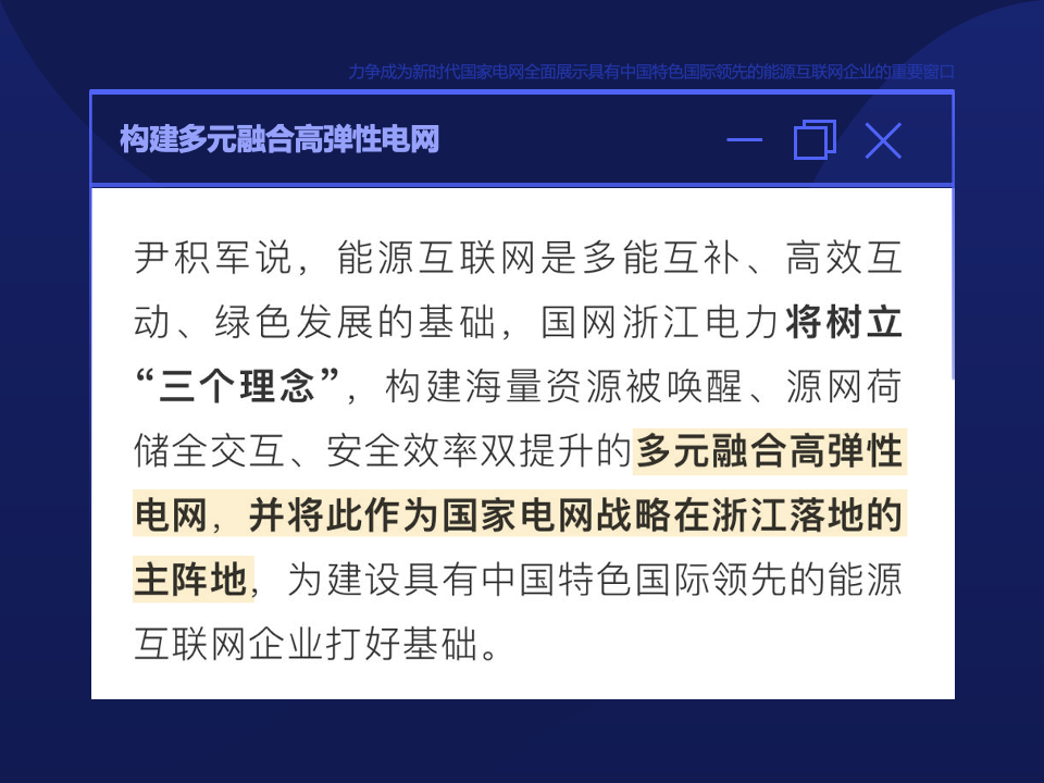為(wèi)此,國(guó)網浙江電(diàn)力創造性地(d§♠ì)提出了(le),建設能(néng)源互聯網形态下(xià)的(de)多×€(duō)元融合高(gāo)彈性電(diàn)網,大(dà)幅提高(gāo)全社會(® ♣♦huì)綜合能(néng)效水(shuǐ)平,推動全社會(huì)綠(lǜ)色低(dī)碳發展,并将其作(zuò)為(wèiα)打造“努力成為(wèi)國(guó)家(jiā)電(diàn)網建設具有(yǒu)中國(gu"±ó)特色國(guó)際領先的(de)能(néng)源互聯網企業<₽∏>(yè)的(de)重要(yào)窗(chuāng)口”的(de)主陣地★π(dì),作(zuò)為(wèi)今後一(yī)段時(shí)間(jiān)國(guó)網浙江電φ☆↑(diàn)力工(gōng)作(zuò)的(de)一(yī)條主線。