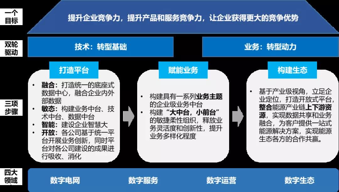 電(diàn)網企業(yè)數(shù)字化(huà)轉型總體(tǐ)框架可↓$←↕(kě)以概括為(wèi)“一(yī)個(gè)目标、雙輪驅動、三項步驟、四大(>≈¥dà)領域”。