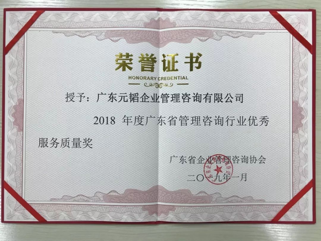 元韬公司榮獲“2018年(nián)度廣東(dōng)省管理(lǐ)咨詢行(xíng)業±>↔(yè)優秀服務質量獎”