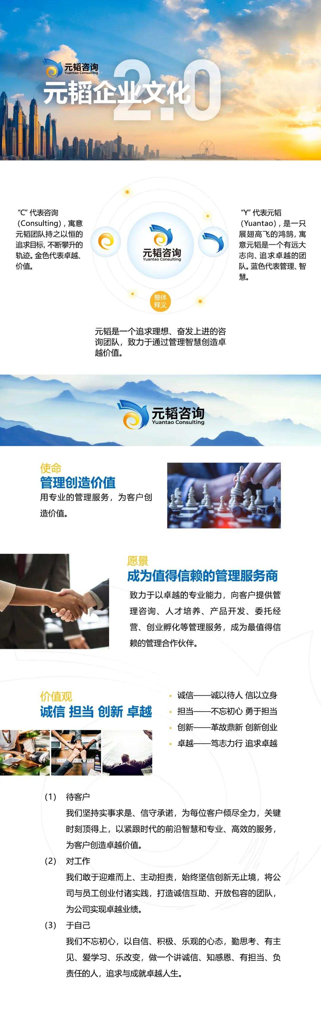 元韬公司結合新形勢、新挑戰,打造以“管理(lǐ)創造價值”✔Ω為(wèi)核心的(de)企業(yè)文(wén)化( <huà),即日(rì)起發布元韬企業(yè)文(wén)化(huà)2.0版本。