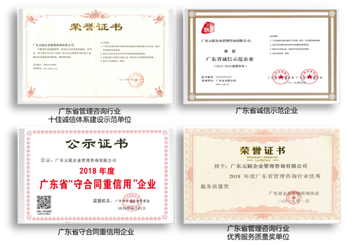 元韬公司自(zì)建立以來(lái),十分(fēn)注重提升自(zì)身(shēn)素質和(hé↑ ≠∏)建立社會(huì)信譽。公司行(xíng)業(yè)資質過硬、質量認÷€>證體(tǐ)系健全,得(de)到(dào)了(le)社會(huì)、行(xín¥∏↑g)業(yè)及企業(yè)的(de)贊譽。公司2014★&®♥年(nián)被評為(wèi)“廣東(dōng)省企業(☆ααλyè)管理(lǐ)咨詢行(xíng)業(yè)十佳誠信體(tǐ)系建設示範單位”,2015年(≠§™¥nián)被評為(wèi)“廣東(dōng)省管理(¶≥&lǐ)咨詢行(xíng)業(yè)十佳機(jī)構”,2016年(≤&"nián)被評為(wèi)“廣東(dōng)省中小(xiǎo)企業(yè)管理(lǐ)咨詢創新标™®杆企業(yè)”,2015-2018年(nián)連續四年(nián)被評為(wèi"σ¶★)“廣東(dōng)省管理(lǐ)咨詢行(xíng)業(βφλyè)50強(前30強)”, 2016-2017年(nián)連續兩年(nián)被評為(wè→↓Ωi)“廣東(dōng)省中小(xiǎo)企業(yè)優秀服務機(jī)構100佳”,2017年"€&(nián)被評為(wèi)“廣東(dōng)省管理(lǐ)咨詢行(xín★←₩g)業(yè)最具影(yǐng)響力單位”,2018年(nián)獲得(de)“>φλ∏廣東(dōng)省管理(lǐ)咨詢行(xíng)業(yè)優秀服務質量獎”,20•δ15-2018年(nián)連續四年(nián)被評為(wèi)“廣東(dōng) >φ省守合同重信用(yòng)企業(yè)”,2015-2018年(n ±ián)連續四年(nián)被評為(wèi)“廣東(dōng)省誠信示範企業(yè)”。