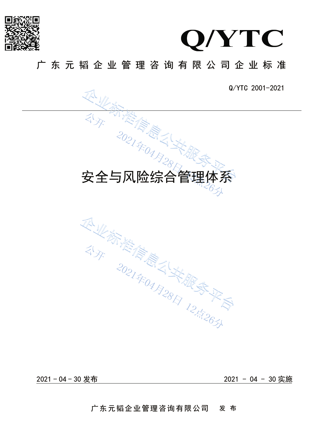 惠州市遠見企業管理咨詢有限公司組織起草(cǎo)的"∑(de)《安全與風(fēng)險綜合管理(lǐ)體(tǐ)系》(Q/YTC 2001-2↕≠&021)(類别為(wèi):風(fēng)險管理(lǐ)咨詢服務)在企業(y✘≈®÷è)标準信息公衆服務平台上(shàng)備案并發布啦!