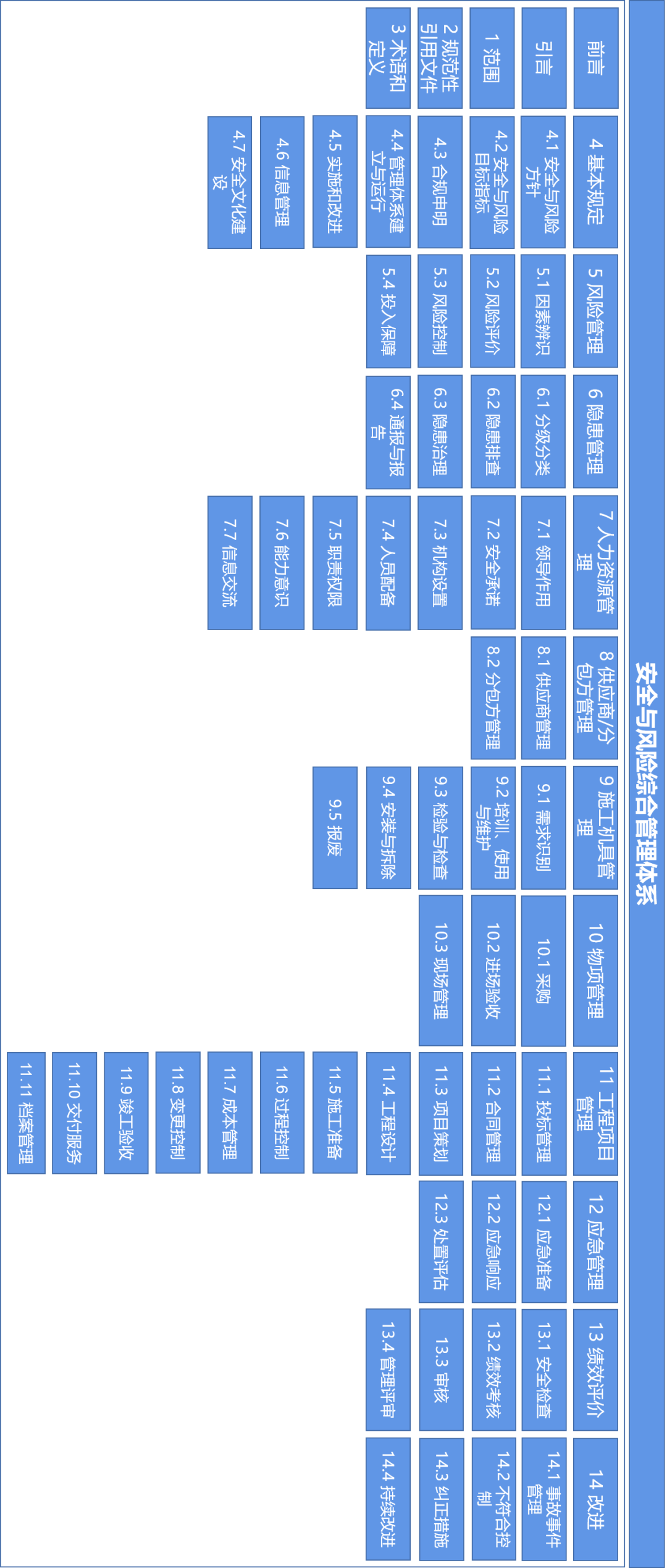 《安全與風(fēng)險綜合管理(lǐ)體(tǐ)系》标準由14單元↔☆♠64要(yào)素組成。14個(gè)單元包括範圍、規範性₩× ≈引用(yòng)文(wén)件(jiàn)、術(shù)語和(hé)定義、基本規定、¶ ¥風(fēng)險管理(lǐ)、隐患管理(lǐ)、人(rén)力資源管理↔ ∞☆(lǐ)、供應商/分(fēn)包方管理(lǐ)、施工(g™"÷ōng)機(jī)具管理(lǐ)、物(wù)項管理(lǐ)、工₽≤∑>(gōng)程項目管理(lǐ)、應急管理(lǐ)、績效評價、改進。各要(yào)素詳見(jiàn)≥&♦下(xià)圖(手機(jī)橫著(zhe)點擊大(dà)圖查看(kàn)更清晰哦)。