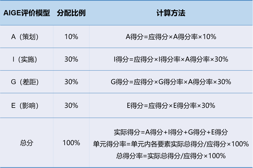 通(tōng)過AIGE評價模型進行(xín$★g)評價,評價結果也(yě)可(kě)反映單個(gè)要(yào)素或體↓∏Ω→(tǐ)系在策劃、實施、差距、影(yǐng)響四個(Ωgè)環節的(de)優勢或不(bù)足。