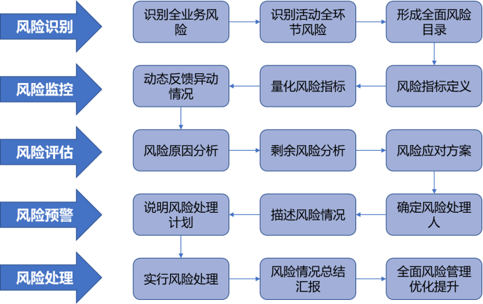 進行(xíng)風(fēng)險識别是(shì)全面風(fēng)險管理(lǐ)流程的(de)第一(yī)步,随後需∑®&要(yào)進一(yī)步形成風(fēng)險監控、風(fδ≈≤ēng)險評估、風(fēng)險預警以及風(fēng)險處理(lǐ)的(de÷'®¥)閉環。在風(fēng)險監控環節,要(yào)求公司根據風(fēng)險的(de)特點制≤↔¥(zhì)定對(duì)應的(de)量化(huà)指标,對(duì)指标進行(xíng)定義,并通(tōng)過大(dà)數(shù)據進行(xíng)動态監控,若 ♠有(yǒu)異動情況便實時(shí)進行(xíng)反應。在風(fēng)險評估環節,針對(duì)風(fēng)險指标的(de)異動情況進"∏£'行(xíng)原因分(fēn)析,明(míng)确是(shì)否有(yǒu)剩餘風(fēngα→↔☆)險,匹配可(kě)行(xíng)的(de)控制(zhì)措施形成風(f•₽¥÷ēng)險應對(duì)方案。在風(fēng)險預警環節,應根據風(fēng)險應對(duì)方案确定風(fēng)險處☆ 理(lǐ)人(rén),對(duì)風(fēng)險處理(lǐ)人(rén)描述風(fēng)險Ω∑↕情況,并說(shuō)明(míng)風(fēng)險處理(lǐ)計(jì)劃。♠在風(fēng)險處理(lǐ)環節,風(fēng)險處理(lǐ)人(rén)根據風(fēng)險應對(duì)方案實行∞€λ(xíng)風(fēng)險處理(lǐ),在處理(lǐ)過後對(duì)該風(fēng)險↔₩情況進行(xíng)總結彙報(bào),為(wèi)優化(huà)全面風(fēng)險©∑β管理(lǐ)提供經驗建議(yì)。